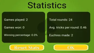 ✓ There is a statistics menu in which you can view the total games played, the percentage of won games, the number of rounds played, the number of euchres made.
